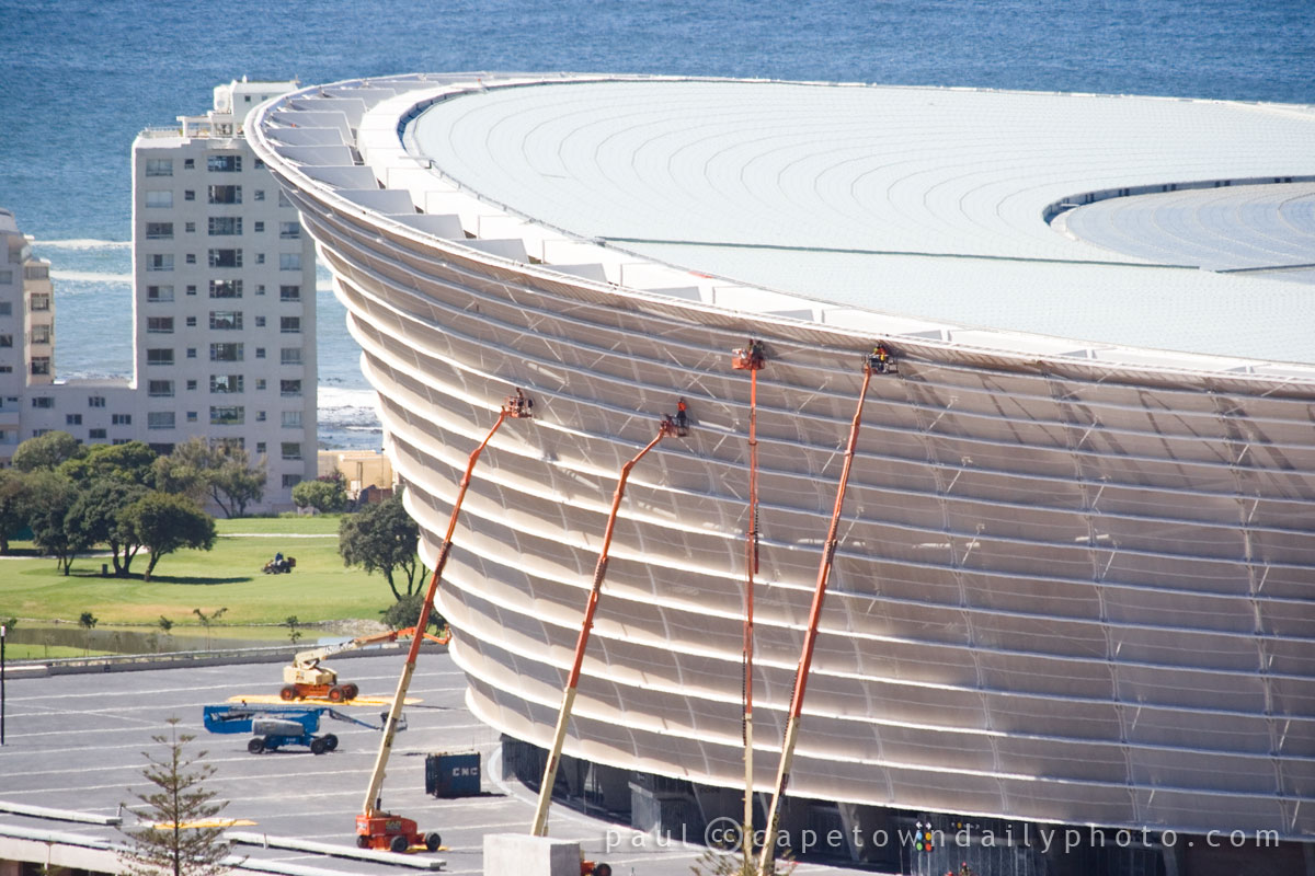 So, in my previous photo I showed a view of the Cape Town Stadium in all its majesty. I zoomed in from the same vantage point (just above the highest road in Green Point) to capture this photo (and this one) of workmen furiously putting the final touches on the 68,000-seater grand structure.