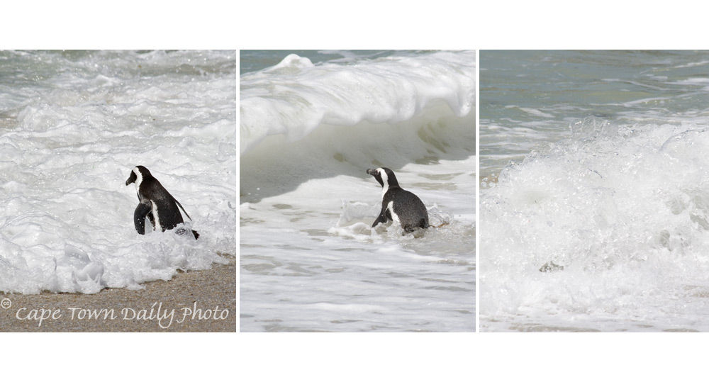 So, today I'm posting a series of photos, taken a couple of days ago, of one poor penguin at Boulders in Simon's Town. The second wave caught him a little by surprise and he vanished, tumbling beneath the wave.