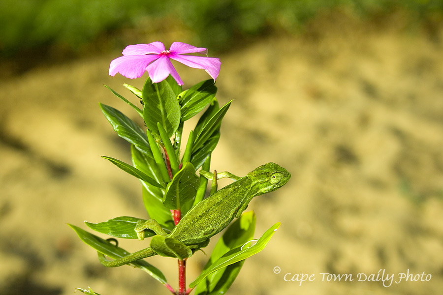 Charlie the chameleon came out to smell the flowers today. Most South Africans with a reasonably green garden have at least two or three chameleons lurking. They're quite common to countries with warm climates, although I'm sure that some of you are quite unfamiliar with the chameleon.