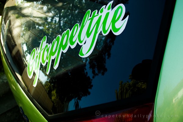 As I walked past this car I had to smile at the sticker on the rear window. The word "gifappeltjie" can be translated as "small poison apple" - which I guess could refer to the small car on which the sticker finds itself, or perhaps even the driver.