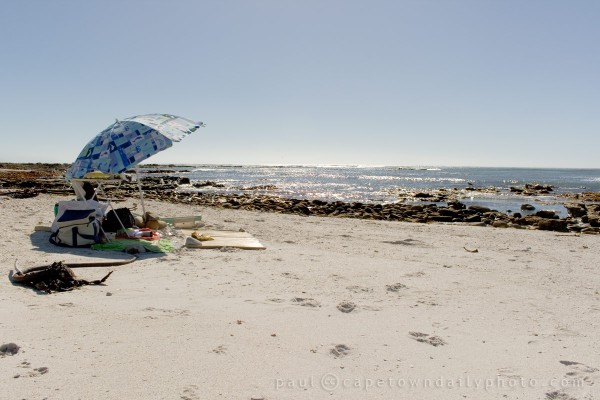 I took the photo of this umbrella on a small beach in Kommetjie while the owners were sitting in the gentle waves a few metres to the right of us. I did find it a little strange that there weren't any more people swimming in the area. There were (further down the coast, to the right) a dozen or more surfers catching waves... but very few sunbathers.