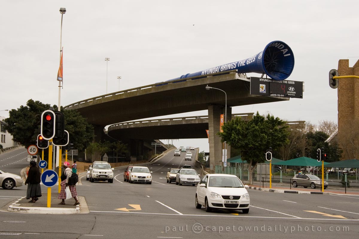This huge vuvuzela, obviously sponsored by Hyundai, was placed on the end of this unfinished bridge in Cape Town. Apparently the vuvuzela has a truck hooter horn attached to the end that will be activated each time a goal is scored in Cape Town Stadium. :)