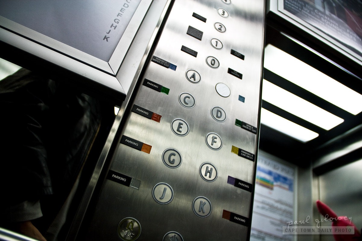 This is the elevator at the Cape Quarter. Upon entering one is met with a combination of the points I made above. Not only this, but one's also overwhelmed by a large poster, a confusing legend, that attempts to guide visitors to the right button.