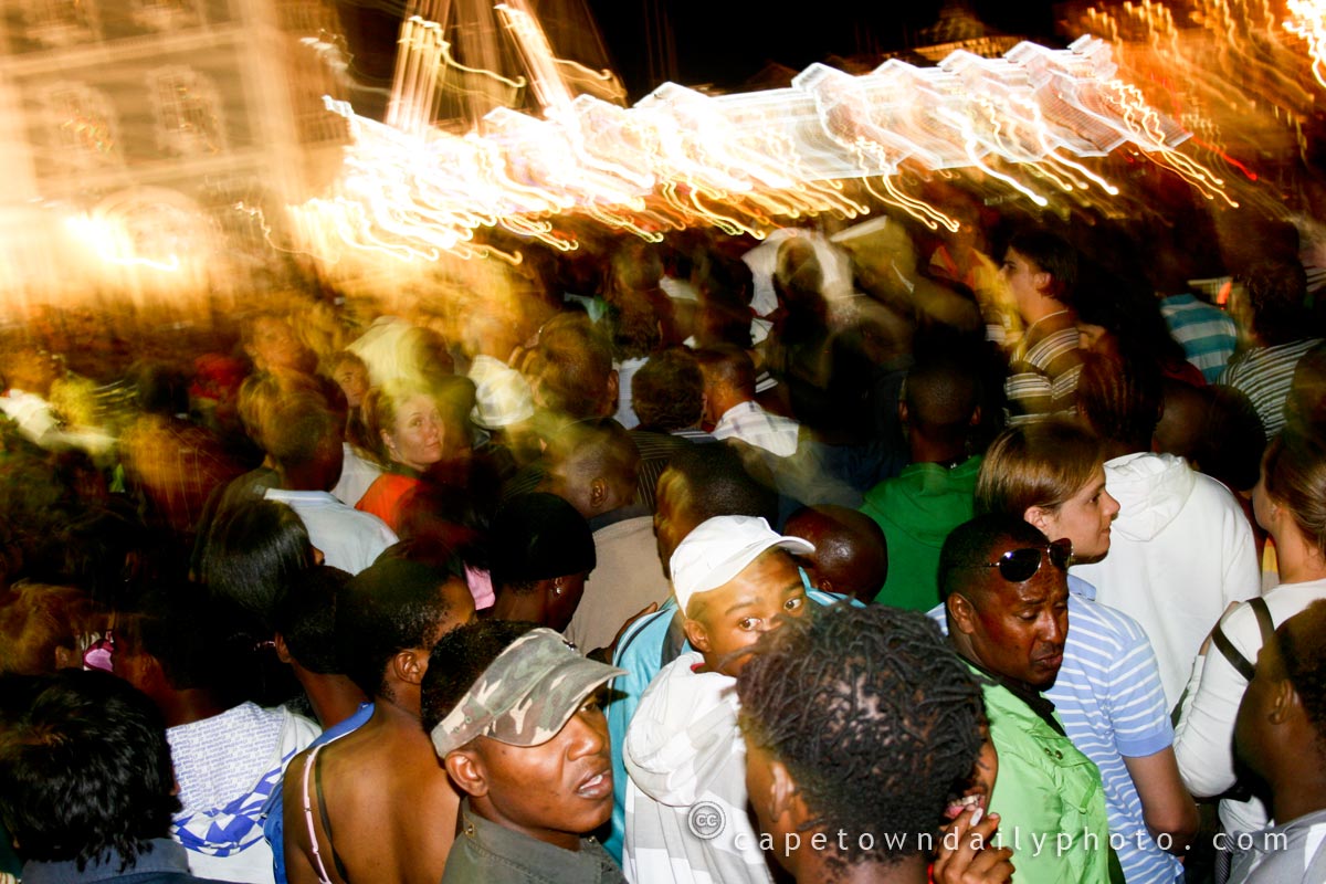 As I said in yesterday's post, it really was busy at the V&A Waterfront last night. If you're familiar with the Waterfront then you'll likely remember the narrow swinging bridge at the Clock Tower. This crowd on the Clock Tower side was trying to change places with a similarly large crowd on the other side. Speaking of the Clock Tower: in case you don't know what it is, the Clock Tower was the old port master's watchtower, built in the late 1800s when the harbour was still full of old-style sailing ships.