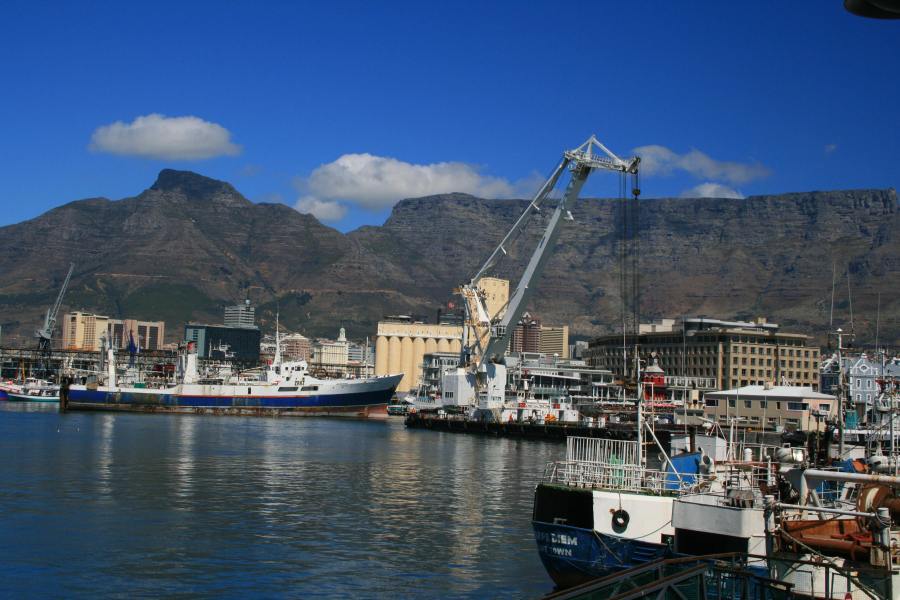 This is the view of Table Mountain and Devil's Peak seen from the back of the Table Bay Hotel. Devil's Peak (on the left) supposedly got its name from the legend of Van Hunks and his pipe-smoking competition with the devil. You can read the full story here - it's a lovely old legend that attempts to account for some of our Cape Town weather phenomena.