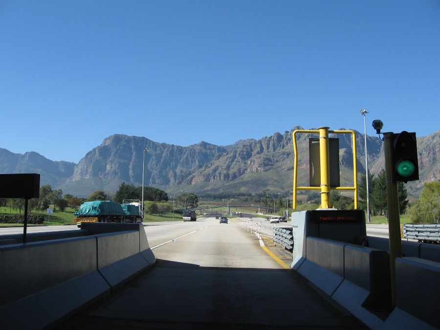 The mountain range in the distance is known as the Boland Mountains. "Boland" is an Afrikaans word meaning "land above". The Boland region is a area of the Western Cape, inland from the sea and thus higher in altitude than the more coastal regions. Some of the towns in the Boland are Wellington, Paarl, Robertson and Worcester.
