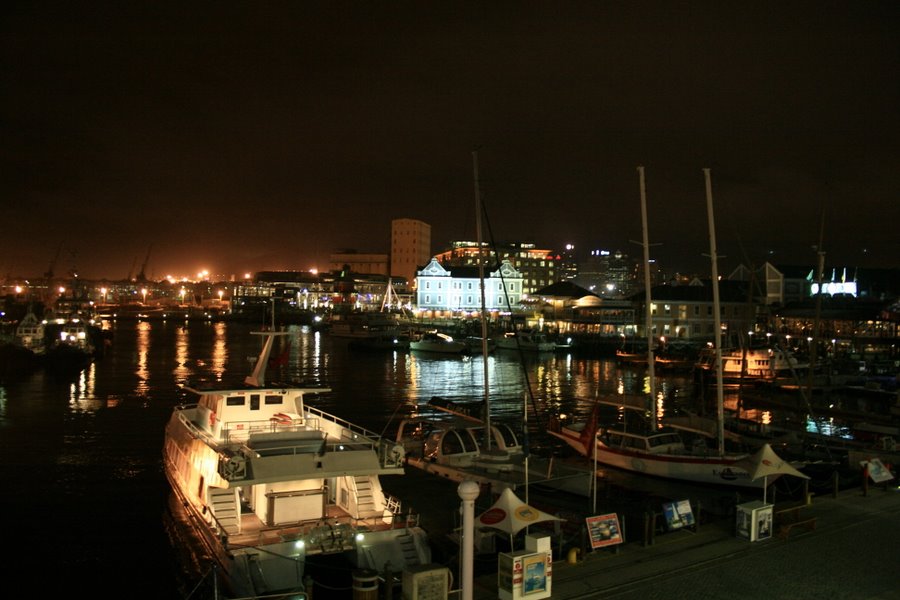 Cape Town Waterfront is really beautiful in the evening. Especially on crisp clear windless nights like this one. The quays are lined with attractive boats, contrasted with industrial-looking harbour cranes, all reflecting beautifully in the water. I picked this photograph over others because of the intrusively blue Victoria & Alfred Hotel that stands out from the black night, making it easy for guests to find.