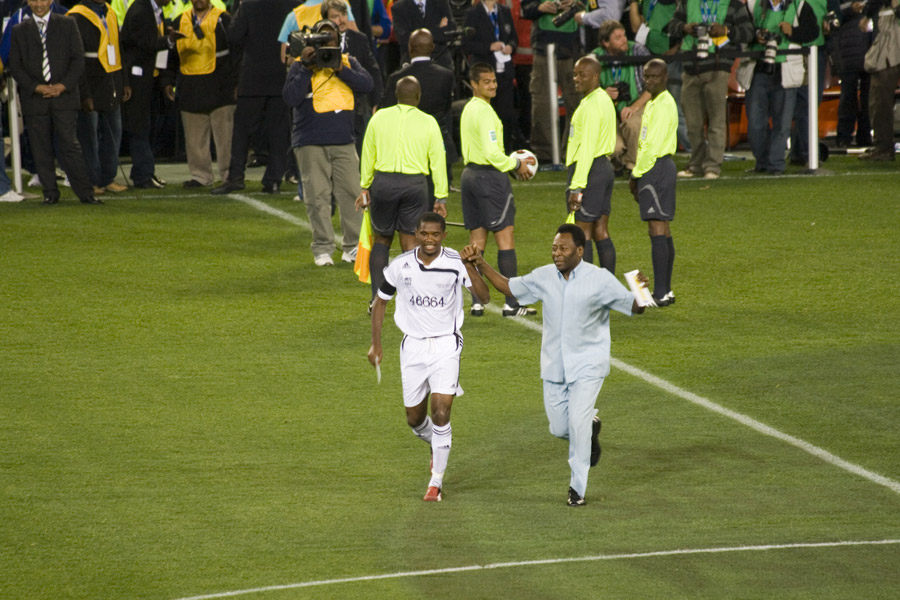 This photo shows international football icon Pelé coming onto the field with Samuel Eto'o of Cameroon. Though Pelé never actually played (he is 67 after all) he started the match, kicking the ball into play.