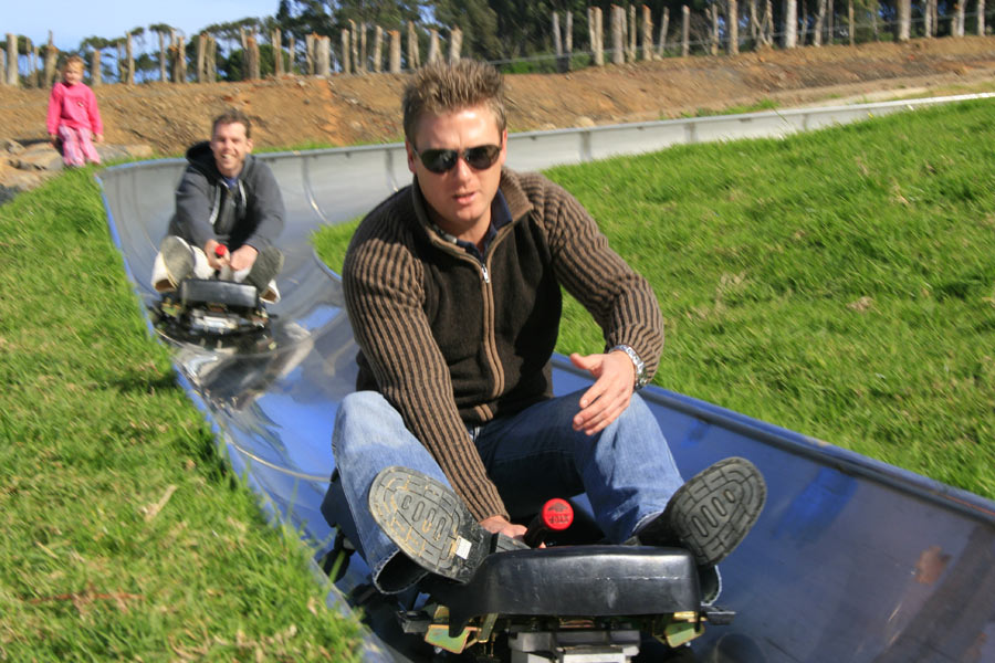 The photo is a bit deceptive - the toboggan ride is much longer and cooler than I've shown here. The cart is pulled (about 200 metres I think) to the top of a wonderfully green hill by means of a slick cable and pulley system. Once at the top the high-speed winding descent starts. It took one or two twists and turns before I had enough faith in the cart to release the brake fully - from then on it was "balls to the wall". :o