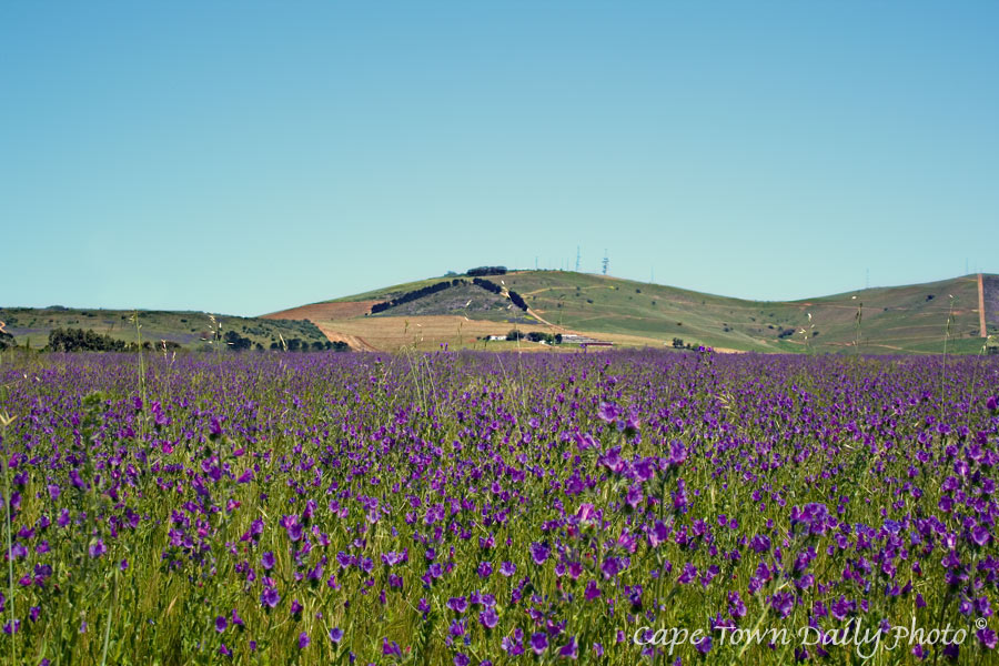 These purple flowers cover the fields and verges in and around Cape Town in springtime. We're not too sure what they actually are (anyone care to shed some light on this?), although they're generally regarded as weeds when they appear in the garden. They certainly look beautiful when they grow in big clumps like this, though.