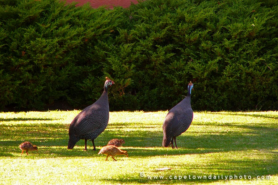 Every morning these guinea fowl (I counted at least forty adults in the group - obviously the rest are not in the picture) make their way along one of the streets in the area, foraging for worms and bugs in the grass. They're wonderful to watch, particularly now that they have a few babies tagging along with them.