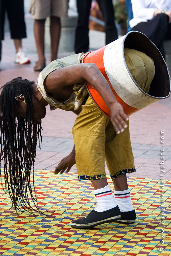 This chap has been at the V&A Waterfront in Cape Town for quite some time. The photo sees him making his way out of the remains of a 25 gallon metal drum. I couldn't find any information about him, but interestingly enough, based on his accent I realised that he wasn't from South Africa... in fact, I don't think he's from Africa at all. For some reason I had the idea that he may even be American... can it be?