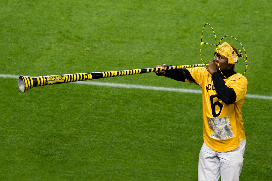 The guy in yellow is the Kaizer Chiefs soccer team's mascot who walks among the fans, rallying them up to support their team. I selected this photo from our archives because today is Africa Day and football is one passion that all brings all Africans together - even if they don't agree on who the best team is.
