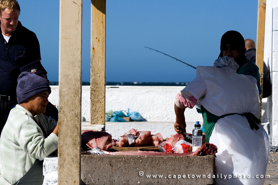 Fishing boats arrive in Kalk Bay after a long shift out at sea. Fishermen hop off the boat and unload crate after crate of ice-covered fish. A few men are responsible for scaling the fish, but this lady is the one who knows just how to cut them up into perfect-looking fillets. I watched her for a while and it was clear that she's being doing this job for years - she worked efficiently and absolutely precisely.
