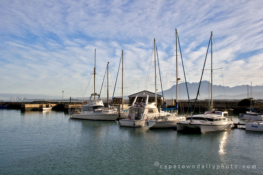 At the request of the fishing community, a harbour was built in Gordon's Bay in the 1930s; eventually, in the 1950s, permission was given for yachts to be moored here as well. The buildings in the background of this shot are part of the South African Naval College, which was formally established in 1966.
