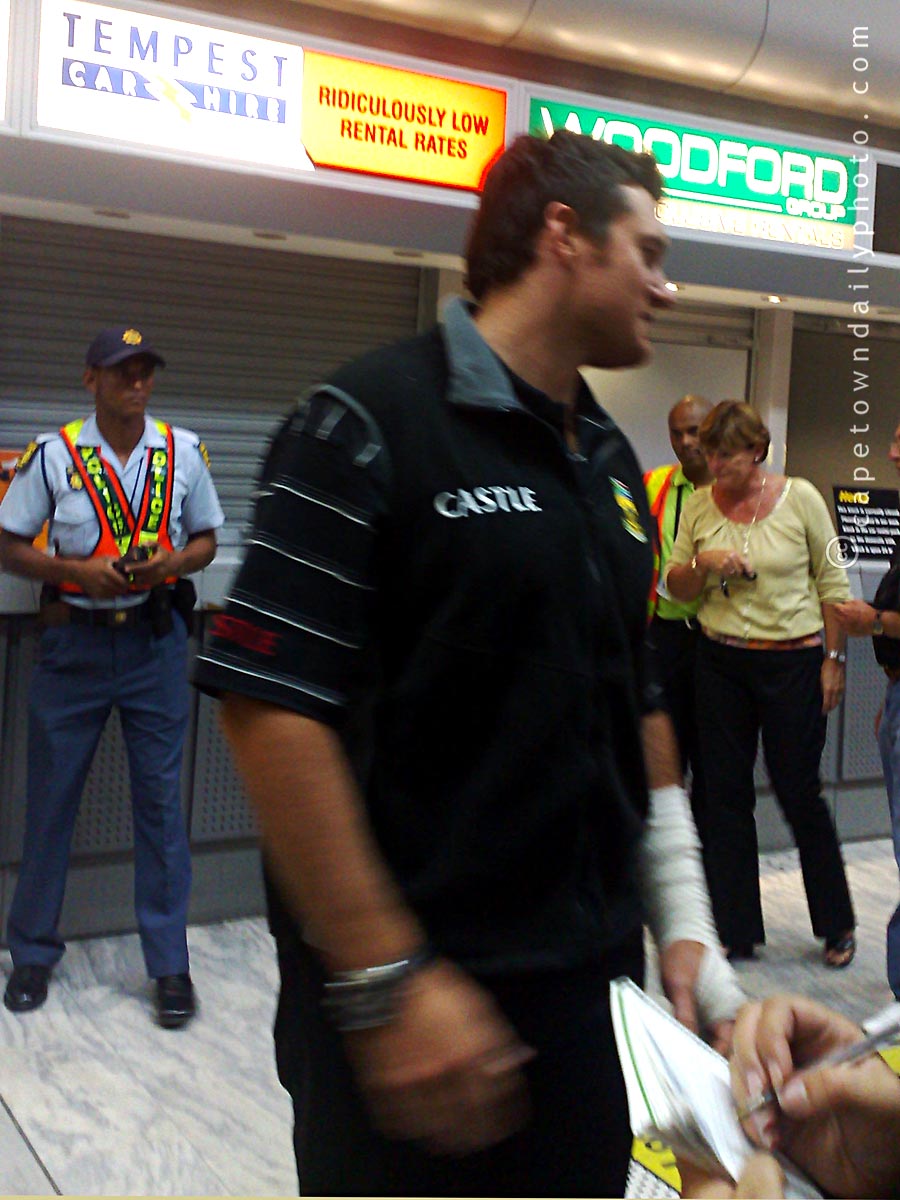 We went through to the airport this evening to join other fans in welcoming our Captain Courageous back home. Unfortunately, it seems that ACSA's online real-time flight info is not quite as real-time as one might have hoped. Graeme's flight landed a full thirty minutes early, but the "expected arrival time" was only updated AFTER the flight had already landed. So, sadly, we arrived too late and missed him.
