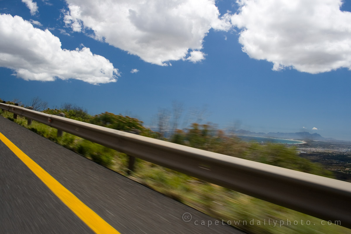 You must have been facing backwards (or driving really badly on the wrong side of the road, overtaking another vehicle by going over two lanes, while taking a photo out the driver side along Sir Lowry’s pass).