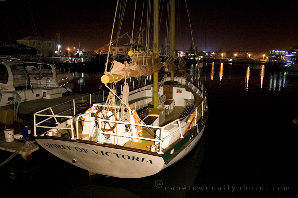 The 58-foot yacht Spirit of Victoria carries passengers on trips around Table Bay, taking them a little way along the Atlantic Seaboard, in fact. At night she lies quietly moored at the north pier of the V&A Waterfront, bobbing about, content after a day of hard work. If you've spent much time looking out into Table Bay you will almost certainly have noticed the schooner's distinctive brown sails blowing in the wind; see another photo here.