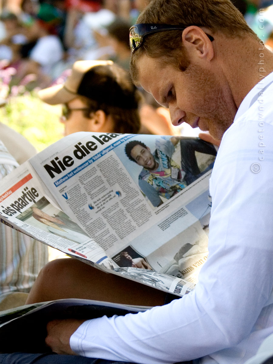 I can so relate to Mr Newspaper Reader in this photo (taken at Newlands yesterday). The vibe at Newlands is energetic. Cricket is interesting once very few hours. Still, I can't say that you would ever find me at the edge of my seat whilst watching a match - especially a test-match - painfully unfolding.
