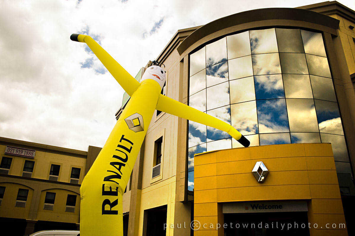 The yellow man in the photo consists of few tubes of plastic with a high-powered fan below. The fan blows air through the tubes, keeping the guy standing. It's helluva amusing to watch him in the wind, because as much as the fan blows to keep him standing, the wind kinks the tube causing him to bend in all directions. Click here to see another photo.