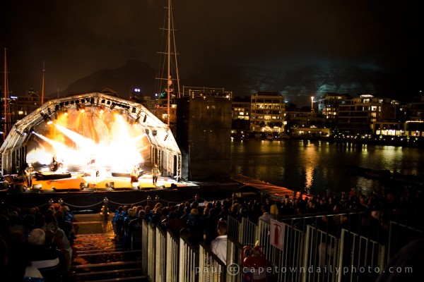Isn't this setting just beautiful? Unfortunately the sun had fully set by the time that I got away from the photographers' area down below and up onto the grandstand. At night it's really difficult to capture the beautiful lights and Table Mountain in the background, but can you imagine the ambience of watching such an awesome performance in the fading Waterfront light from this vantage point?
