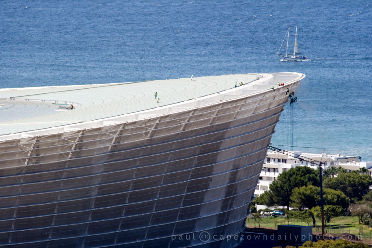 So, in my previous photo I showed a view of the Cape Town Stadium in all its majesty. I zoomed in from the same vantage point (just above the highest road in Green Point) to capture this photo (and this one) of workmen furiously putting the final touches on the 68,000-seater grand structure.