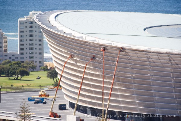 So, in my previous photo I showed a view of the Cape Town Stadium in all its majesty. I zoomed in from the same vantage point (just above the highest road in Green Point) to capture this photo (and this one) of workmen furiously putting the final touches on the 68,000-seater grand structure.