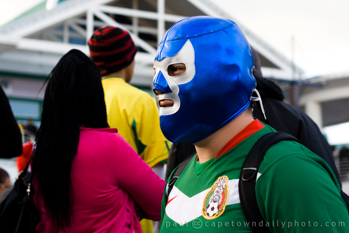 Based on the insignia on his shirt and the fact that the mask resembles that of Blue Demon (El Manotas), a famous Mexican wrestler, it would seem as though he's a Mexico supporter. I must say that I was a little surprised that the police and Waterfront security allowed him to walk around with the mask concealing his face. However, I guess that if he stepped out of line it would be easy enough to spot him in a crowd. :D