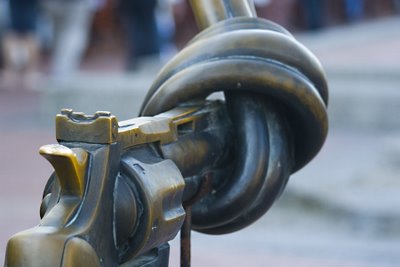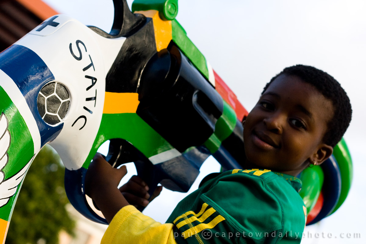 You may recall a photo of a similar knotted gun (also at the Waterfront) that I posted in 2007. Several similar guns, decorated in various countries' colours, have been made for the World Cup football event. The one in this photo is obviously decorated in the South African flag's colours, and you can see the knot tied in the barrel just behind the little girl's head. :)