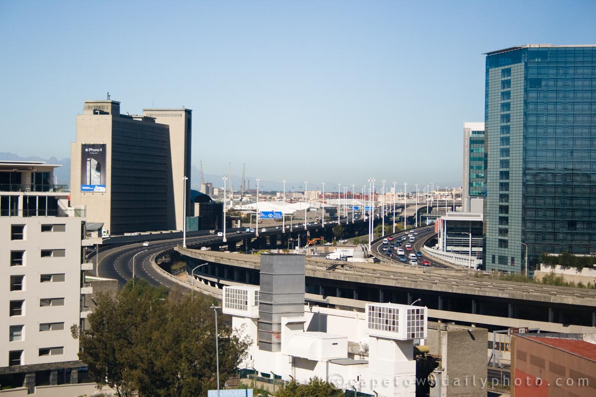 The flyover bridge that you see on the left is Eastern Boulevard. Keeping left takes you to the northern suburbs of Cape Town via the N1 highway whereas keeping to the right leads to the southern suburbs.