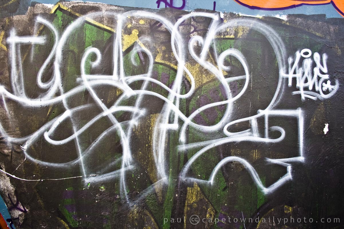 I found this piece of graffiti in Salt River interesting - I think it was because of the dark layers of muted colours beneath, covered by the bold white lines. I stood looking at this piece of graffiti for quite some time before realising that either it never meant anything, or I was just not going to see what the artist was trying to say.