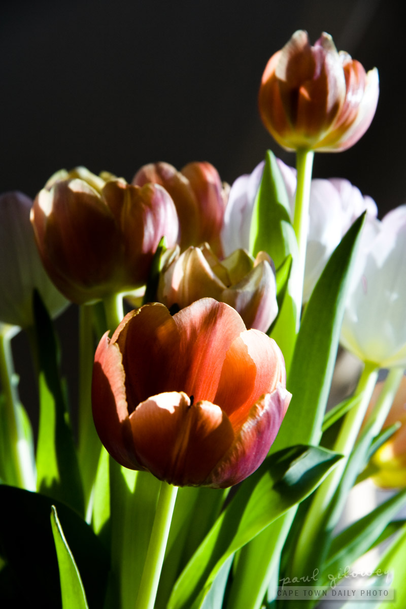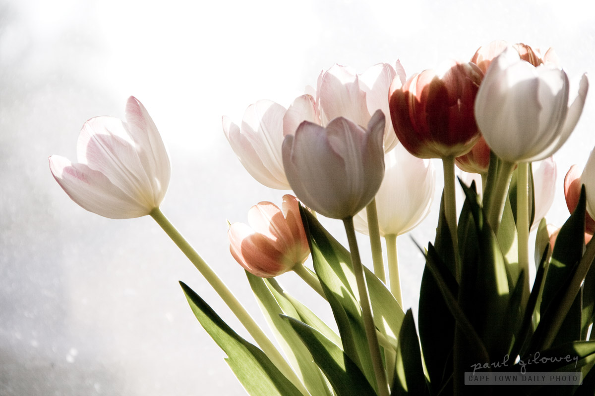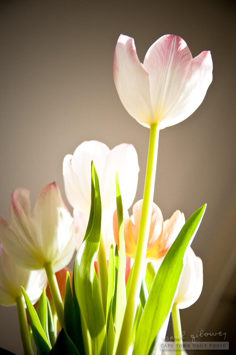 I bought a bunch of Tulips from Woolworths for Kerry-Anne. While photographing them bathed in morning light I realised that taking photos of flowers, perhaps Tulips in particular, is as fulfilling much like photographing beautiful woman - light catches their contours in the most beautiful way.