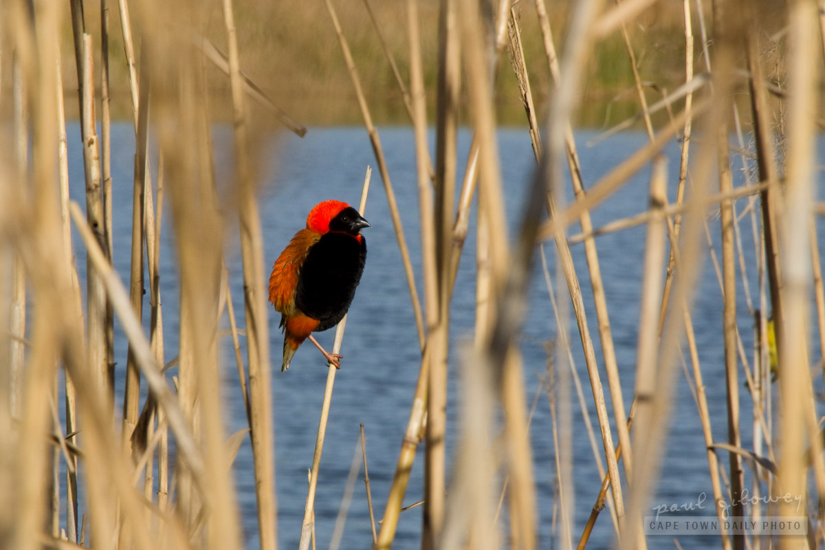 That would be a Red Bishop (Euplectes orix) otherwise known as Southern Red Bishop, (wish whoever keeps changing bird names would stop, I can’t keep up. Such crazy fluffy little things, or at least the males are, the females are rather more discreet. Lovely photo.