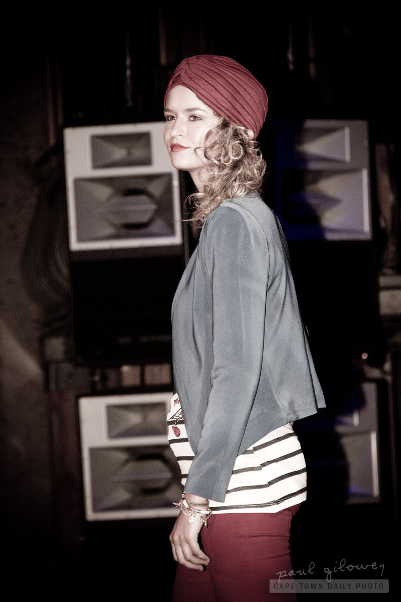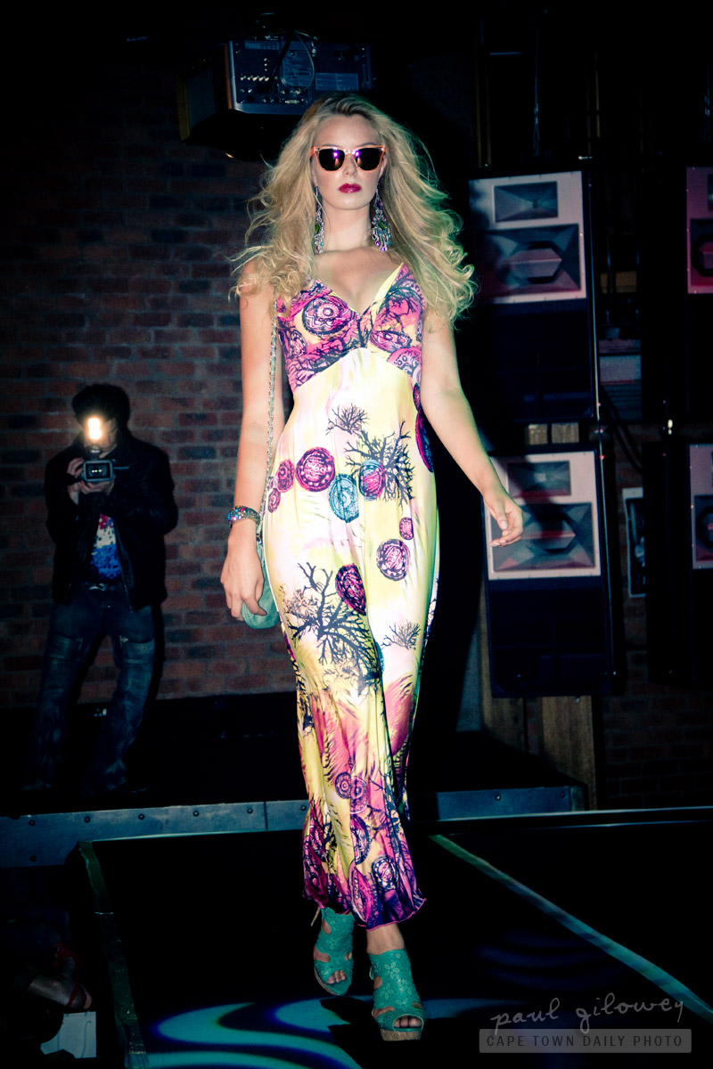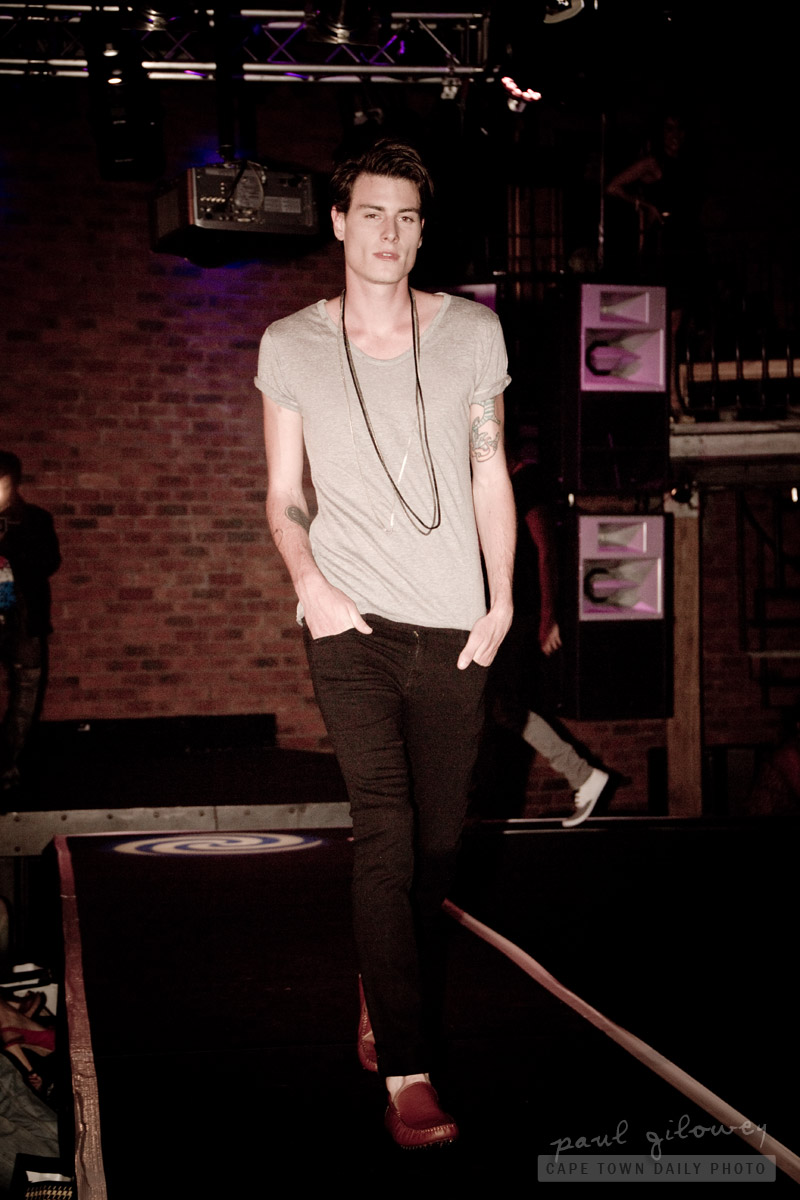 I, and a few hundred other folk, spent the evening at Trinity Supperclub (a restaurant in Cape Town) being entertained by DJ's and treated to delectable chocolate delights from Café Le Chocolatier in Franschhoek. After a little patient waiting the first of the 10 models descended from an iron staircase to the catwalk to display some of what Traffic Clothing's store will be stocked with for Summer.