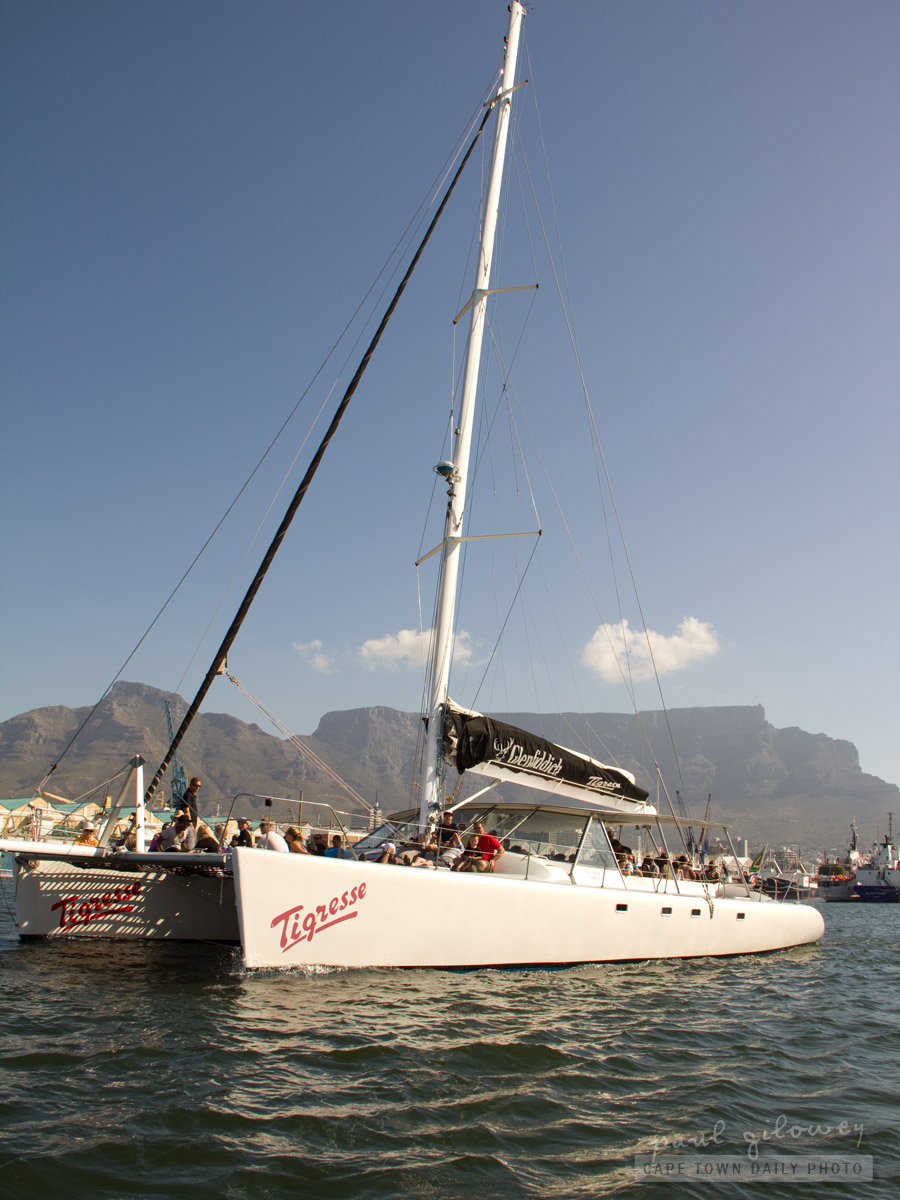 With a maximum capacity of 60 passengers, NK Charters claims that it's sailing catamaran, Tigresse, is the largest in Africa. On this late afternoon we enviously watched the Tigresse leave the V&A Waterfront with a large group of guests on a sunset campaign-cruise. It would have been nice to have been aboard her, rather than on the old boat that we ended up choosing. :(
