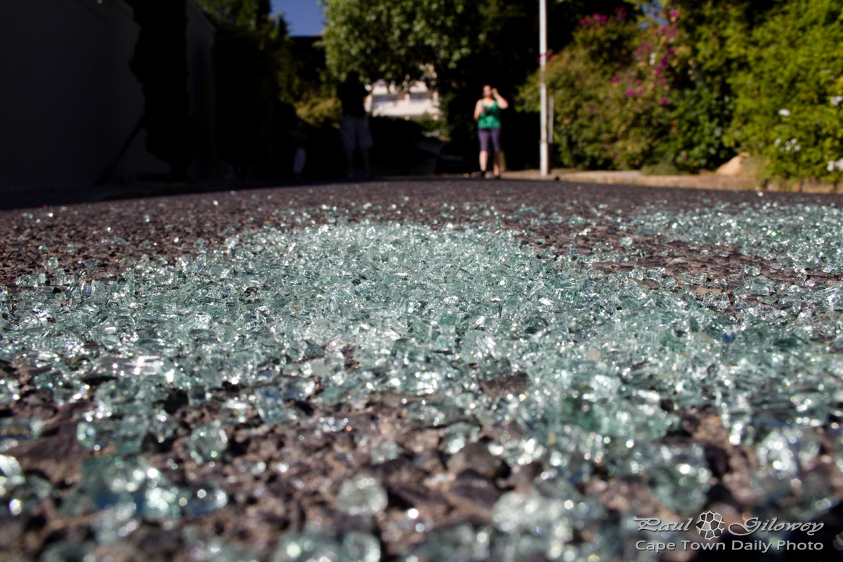 I checked, but alas, they weren't diamonds. They're probably the remnant of a fender-bender or a break-in. Imagine if the glass wasn't laminated - sharp shards of plate-glass would have lain where these relatively-harmless pieces now lie.