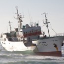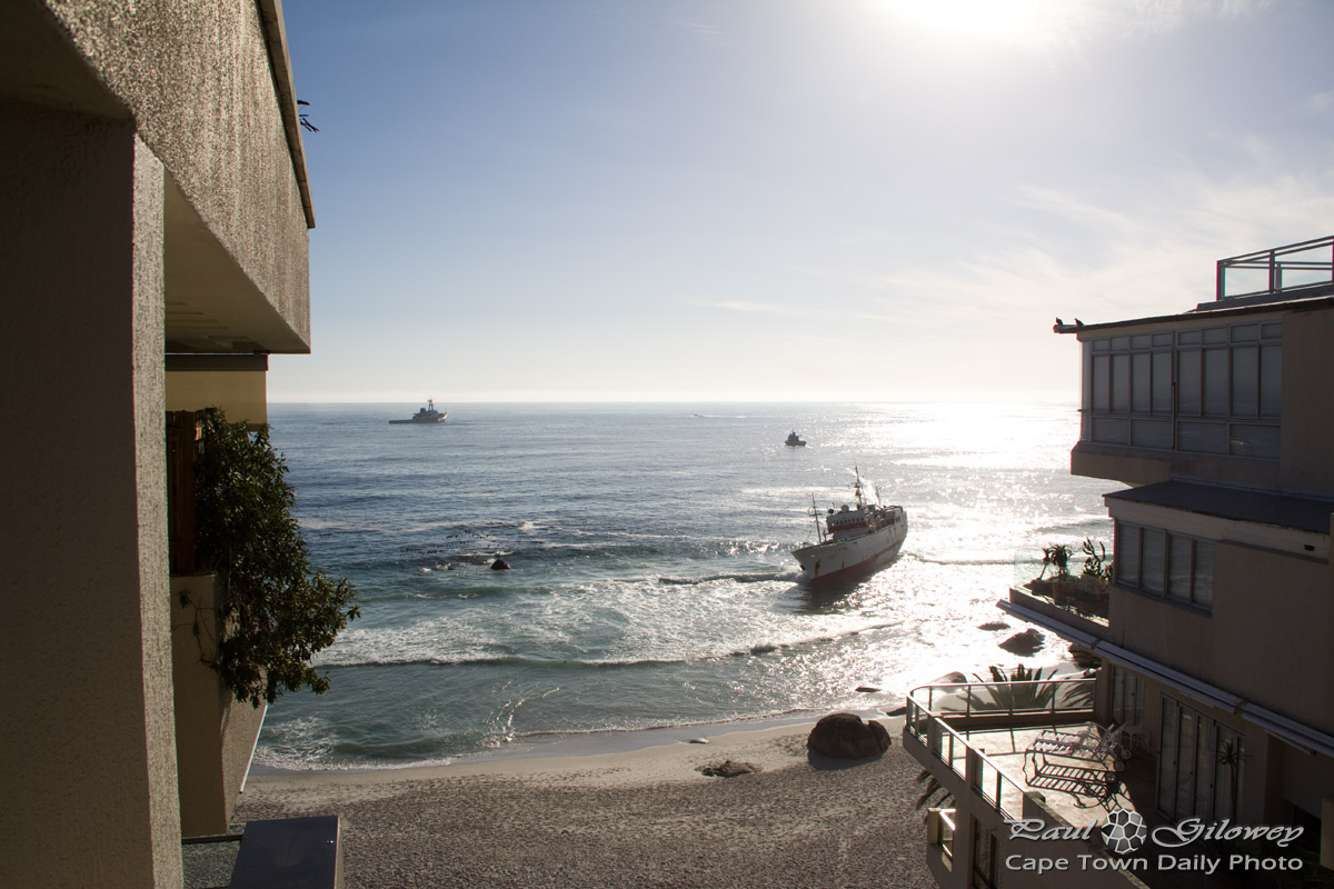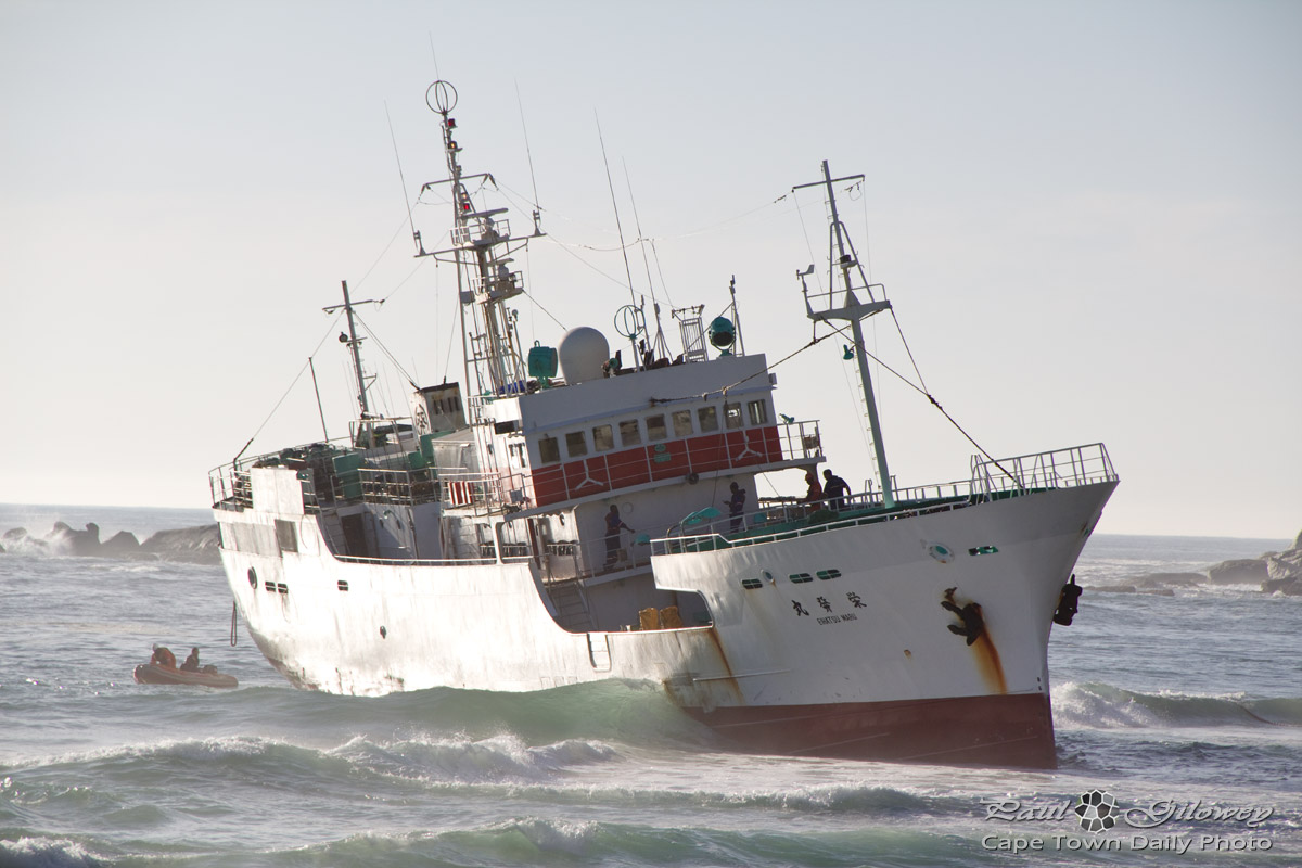 I visited Clifton 2nd beach at about 4pm yesterday afternoon to see a large tug stationed a couple of hundred meters from the ship with one (or two, I think) cables connecting it to the Japanese trawler. A smaller tug was making regular trips to the large tug, and a small rubber boat was used between the tiny tug and trawler. I'm guessing they were dropping off supplies and equipment.