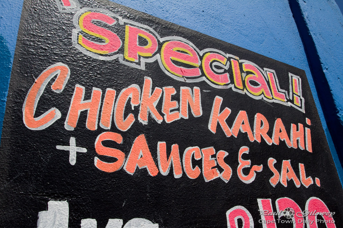 When I saw this sign in Woodstock's Lower Main Road I had no idea what chicken karahi was. Friendly Google was helpful enough to explain that it's a Pakastani and North Indian dish that uses plenty of chili to make it hot 'n spicy. The price of R120 doesn't seem like an exceptional bargain though - unless it's a family pack that they're selling (which is possible if, as I suspect, the white writing in the lower left corner reads 1KG).