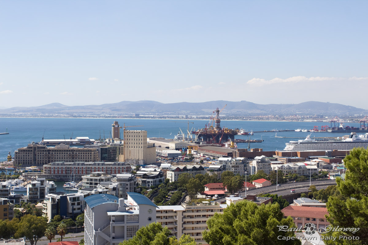In case you're wondering what's in this photo - that platform and tower in the middle of the photo is our resident oil rig; slightly to the left is the brown port control building; and below that (and not quite as tall as the other buildings) is the elegant Cape Grace hotel. The rest of the V&A Waterfront is to the left of this photo, slightly out of view, and the hills at the back of the photo are the Tygerberg Hills, which are quite close to where we live.