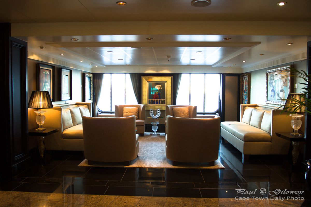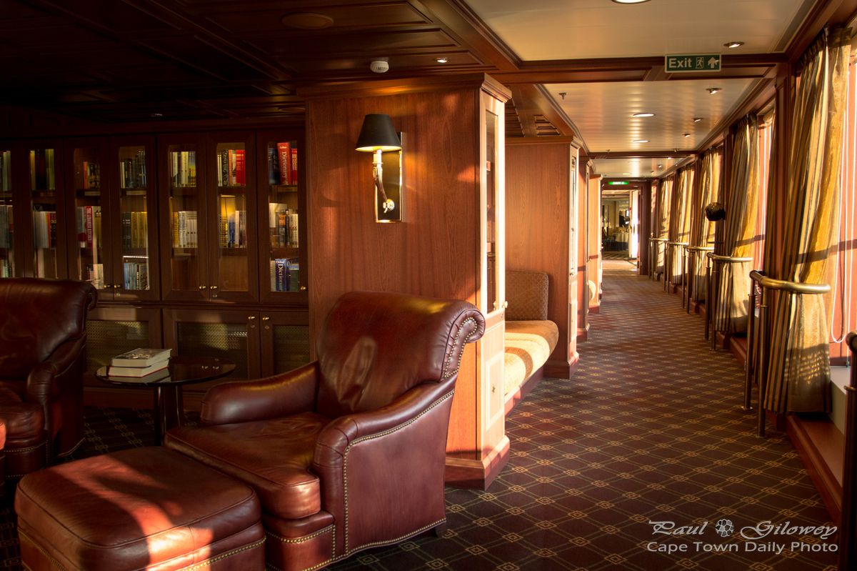 Leading from the buffet restaurant (I'll tell you about the food in my next post) we came across the library in the next photo. You can't see a great deal of it from this view, but isn't what you can see beautiful? The narrow library stretches along for about 30 or 35 meters and is lined with books. Interspersed are small seating areas, each with three or four comfy chairs like the one in this photo. I'm pretty sure you could imagine sitting in silence, reading a book, while enjoying the freshly-brewed illy coffee from the barista station conveniently located right next to the library. ;)