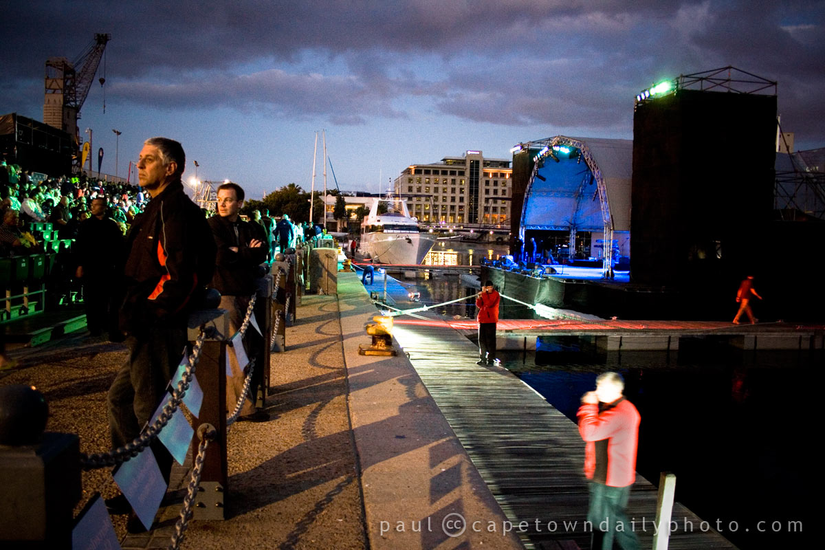 You can't see it in the photo above, but in this photo you'll see that the entire stage on which the band performed was floating about 5 metres off the pier in the V&A's yacht basin. Table Mountain, the setting sun, beautiful yachts, and the city lights filled the background to make the setting comparable in beauty to that of the Kirstenbosch concerts.