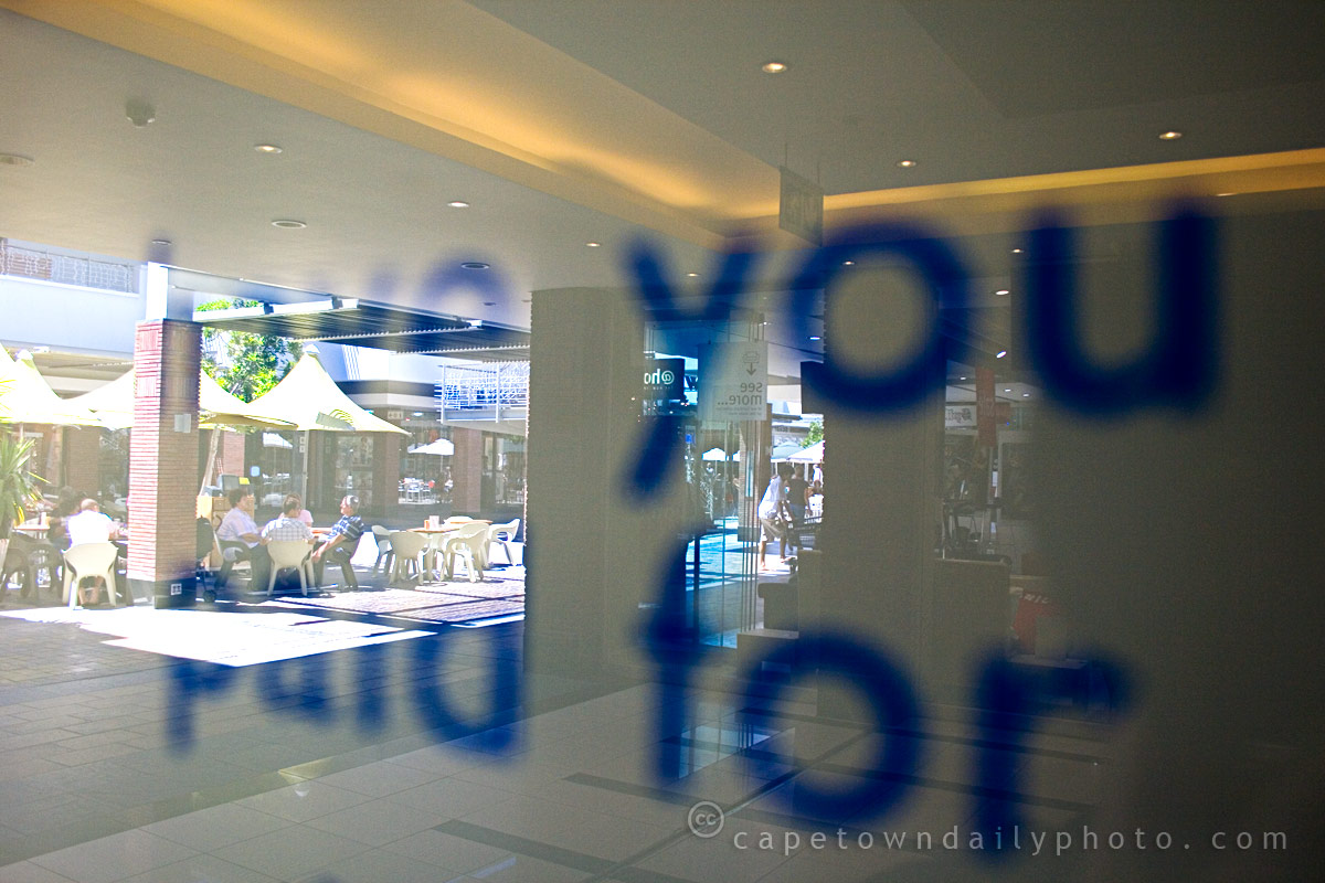 The blurry sign that you see in this photo reminds clients of this shopping centre to pay for their parking before exiting to the boom-gates. I still remain unconvinced that shopping centres aren't ripping us off by forcing us to pay for parking. Certain centres provide free open-air parking and paid undercover parking, leaving customers to decide whether or not they are prepared to pay for some shade from the African sun. This particular centre has no free parking.