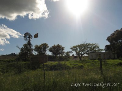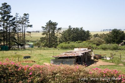 The photo was taken somewhere out the back of Durbanville, about 30 minutes' drive from Cape Town. Isn't it an absolutely beautiful view that these animals have to look out on each day? The mountains, the fields, the flowers... I wonder if they get tired of the view... do you think horses can get tired of a view?