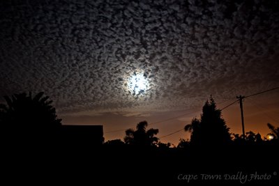 Kerry-Anne's dad called earlier this evening to tell us about the unusual cloud formation in the sky. The clouds were moving pretty quickly and about 5 minutes after I was finished taking photos they were gone.One thing that I noticed while taking this photo was the large number of aeroplanes crossing our skies at night. Several passed in front of the moon as I was taking photos, but it sure is a trick trying to take a photo of them in flight backed by such a bright moon.